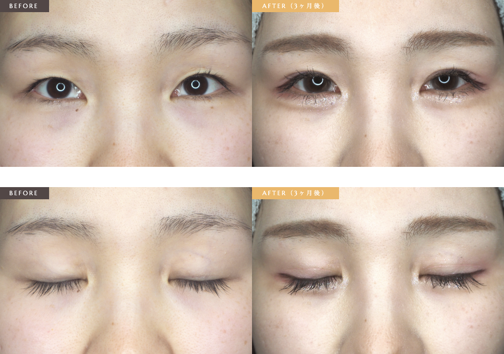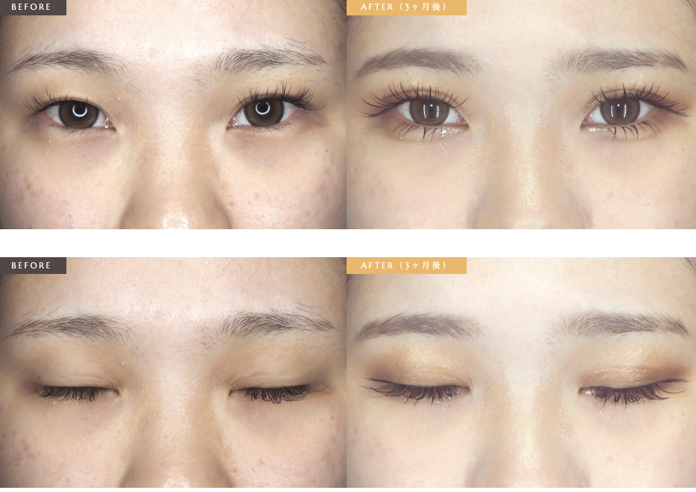 リスク:まぶたの腫れ/手術中の痛み/手術後の内出血/眼瞼下垂/二重の幅の左右差/傷跡/二重のラインが取れるなど(個人差あり)